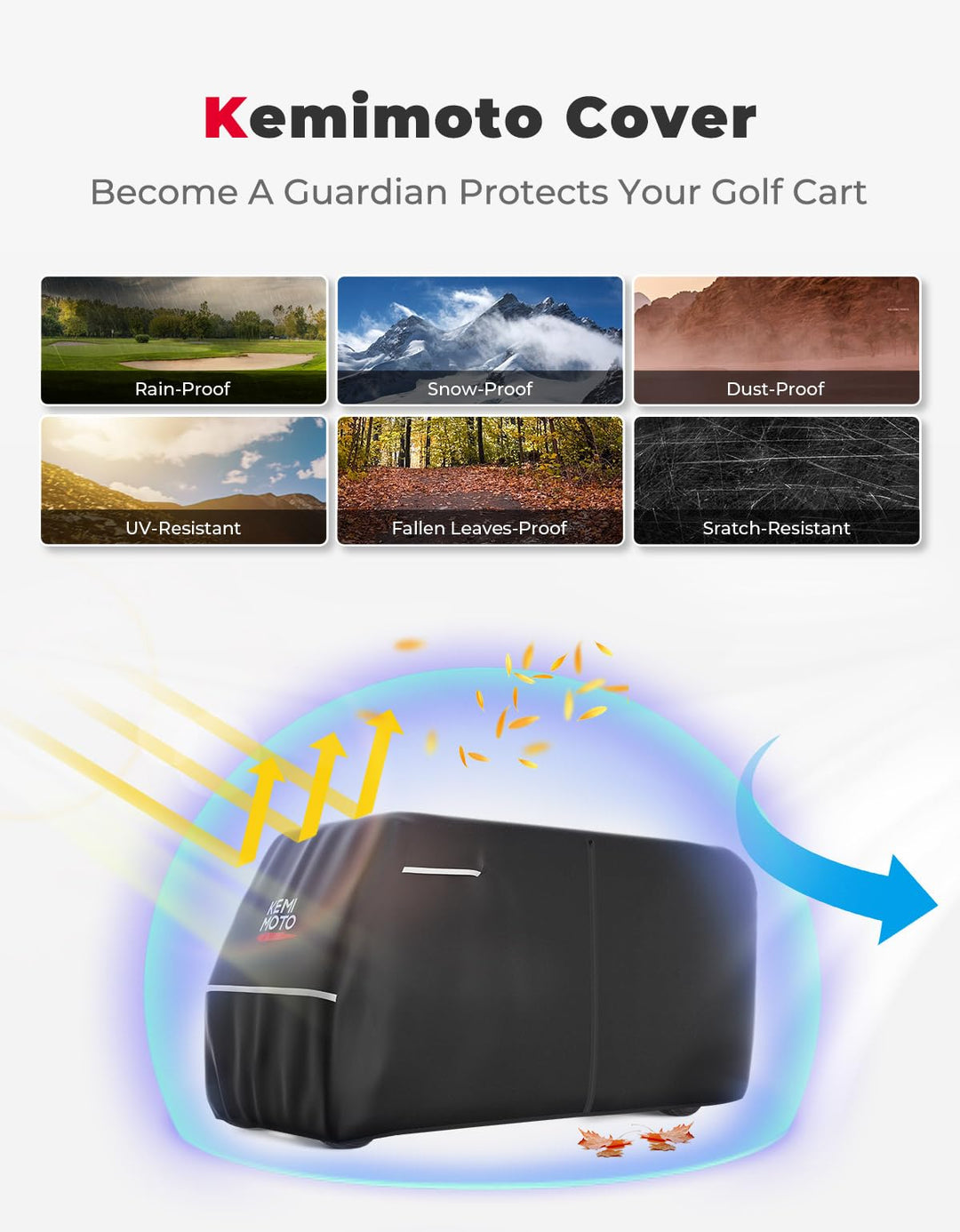 The KEMIMOTO Golf Cart Cover is a heavy-duty rain cover designed to fit 2, 2+2, 4, 4+2, 6, 6+2, and 8 passenger golf carts. It comes with a convenient storage bag and is universally compatible with EZGO and Club Car models, providing robust protection from the elements.