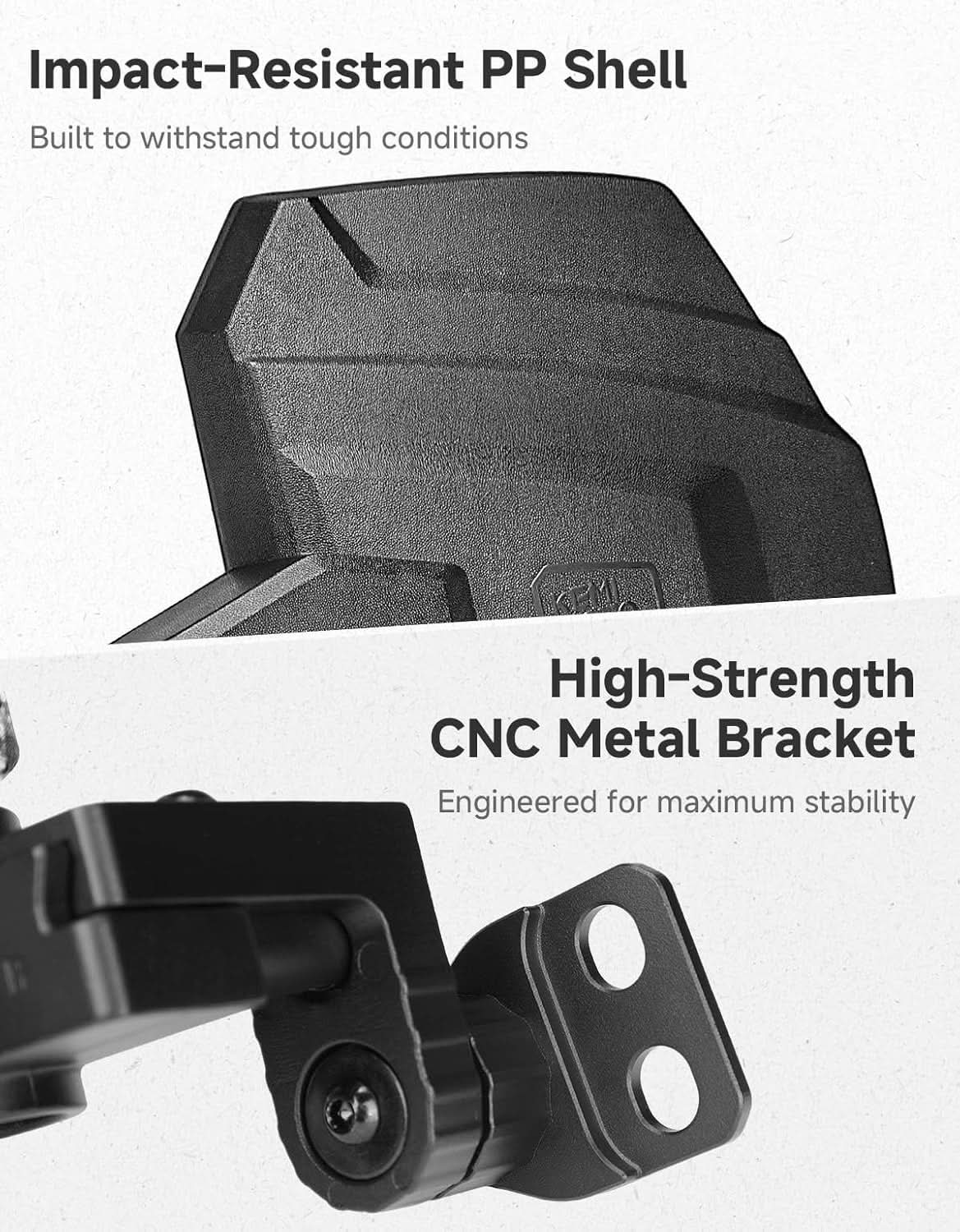 The KEMIMOTO UTV side mirrors feature a multi-adjustment design with a 2.4–4.33 inch extendable arm, allowing you to easily extend or retract the mirror to match your driving position while expanding your field of view. Supporting 360° vertical flip and 230° inward rotation, the mirrors provide full-angle visibility for safer off-road driving. Designed to mount directly using factory screw holes, the installation is quick and secure—simply loosen the original screws, position the mirrors, and retighten them without complicated tools or repeated adjustments. The factory-hole mounting design prevents interference with windshields and doors, ensuring a clean and stable setup. Built from high-strength impact-resistant PP plastic with a CNC-machined base and metal clamp, these mirrors deliver excellent durability and a clear rear view, while the inward foldable structure helps protect against damage when riding through tight trails or encountering obstacles.