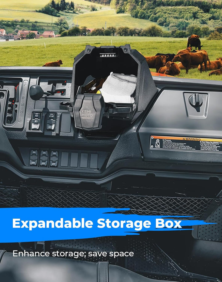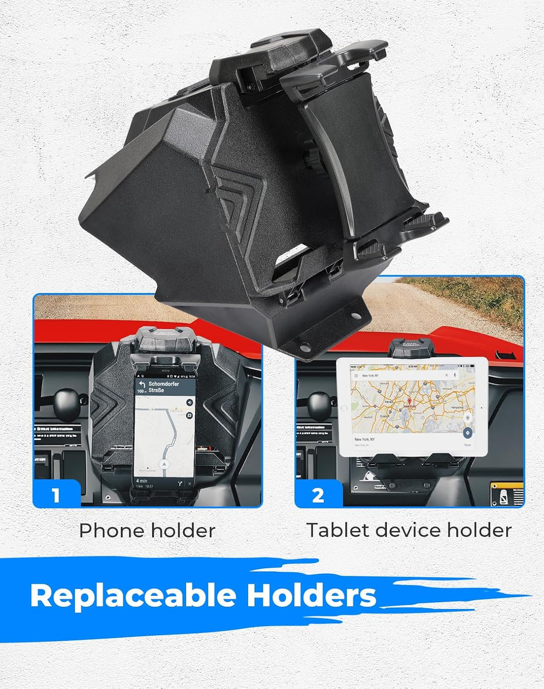 The Kemimoto electronic device mount for Pioneer 1000/ 1000-5/ 1000-6 is just what you need. It has an adjustable clamp that fits devices from 5.1 to 8 inches, so you can easily set it up on your dashboard near the power source and keep your device charged while you drive. Made from strong HDPE material, this mount is built to last and will hold your GPS or tablet securely, even when you're driving fast. The anti-vibration pads help protect your device on bumpy roads. There's extra storage space for your phone, keys, and sunglasses, keeping everything neat and within reach. Make your drive better today with this electronic device mount!