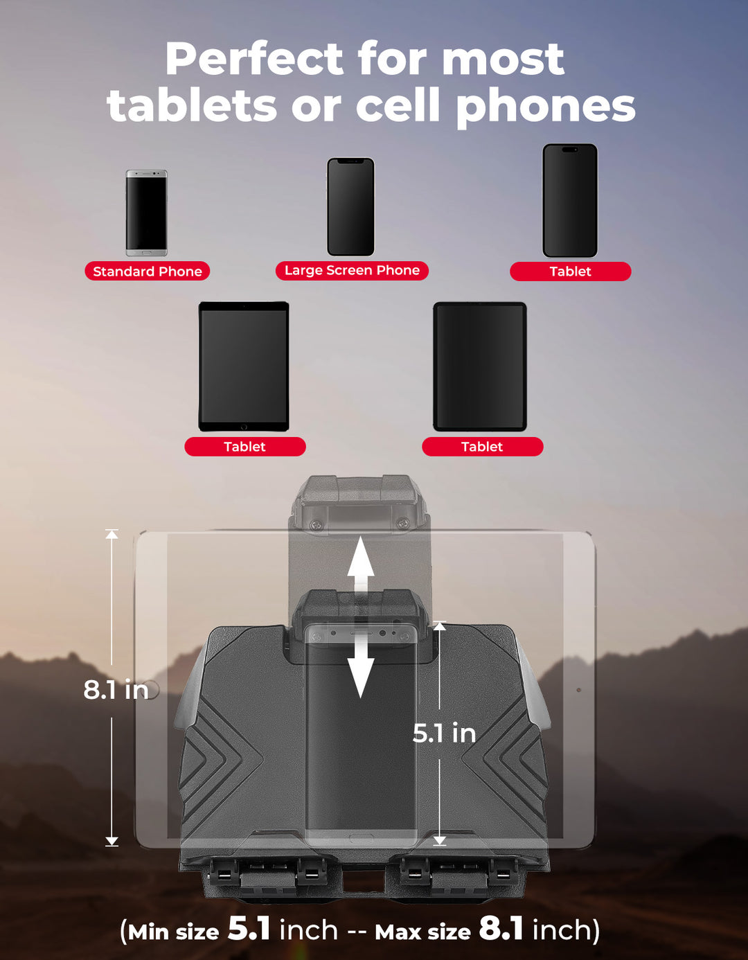 Press the push button, open it and you will find the big bolt. Lose the bolt to adjust it according to your electric device, iPad, or phone. x3 GPS mount can hold most tablets and smartphones between the dimensions of 5.1” (13 cm) and 7.5" (19 cm) and it can hold most model tablets and smartphones wider within 1.5" (with protective case)