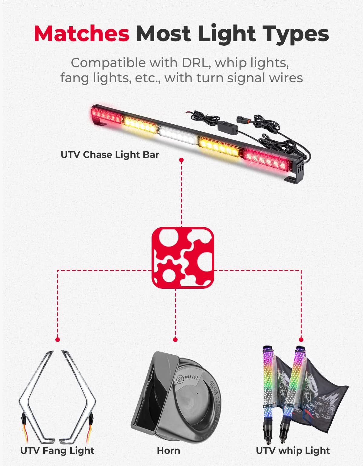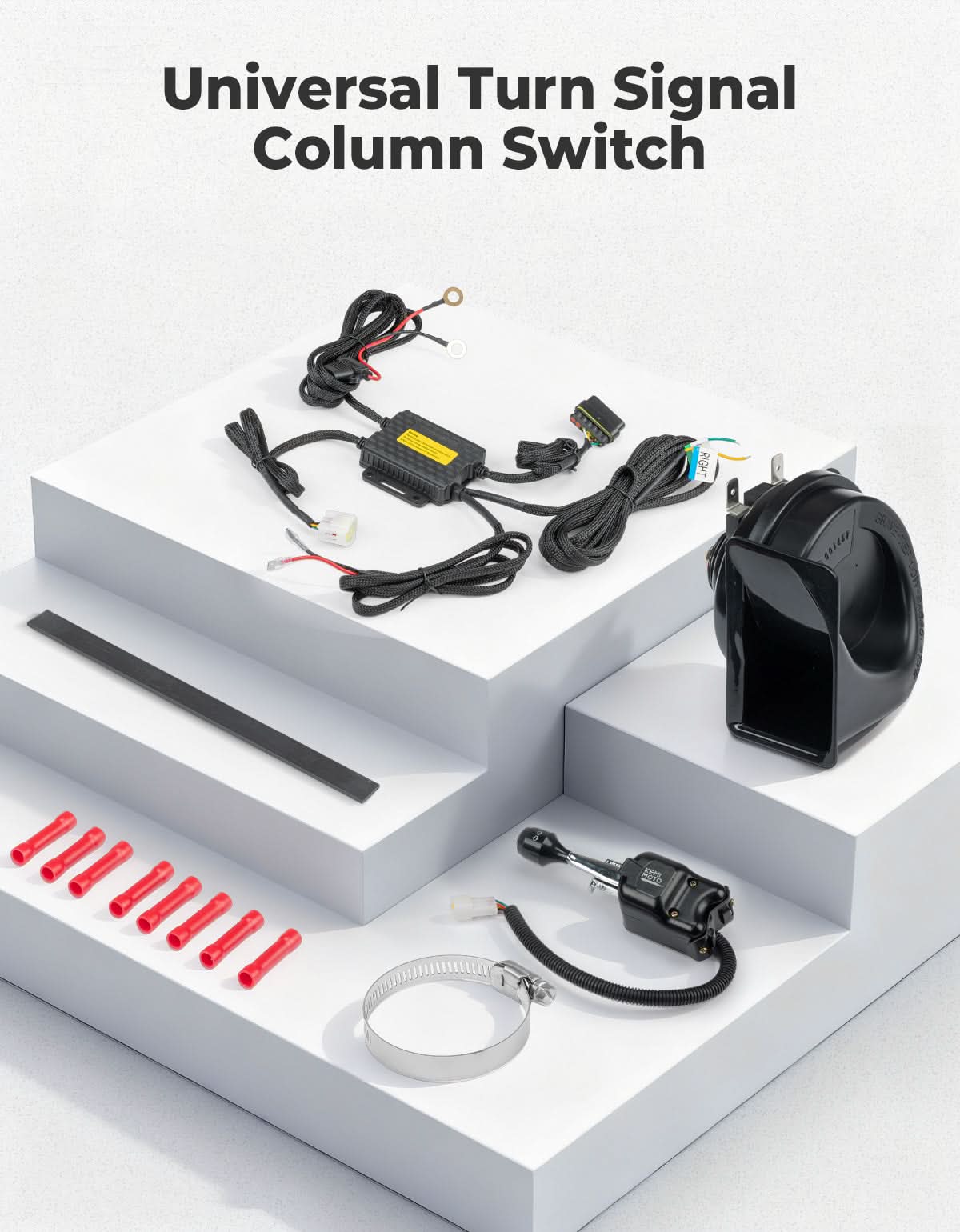 UTV turn signal column switch with 3-in-1 functionality (turn signals, hazard lights, horn), universal fit for most UTVs and golf carts, includes 110dB horn and easy installation.