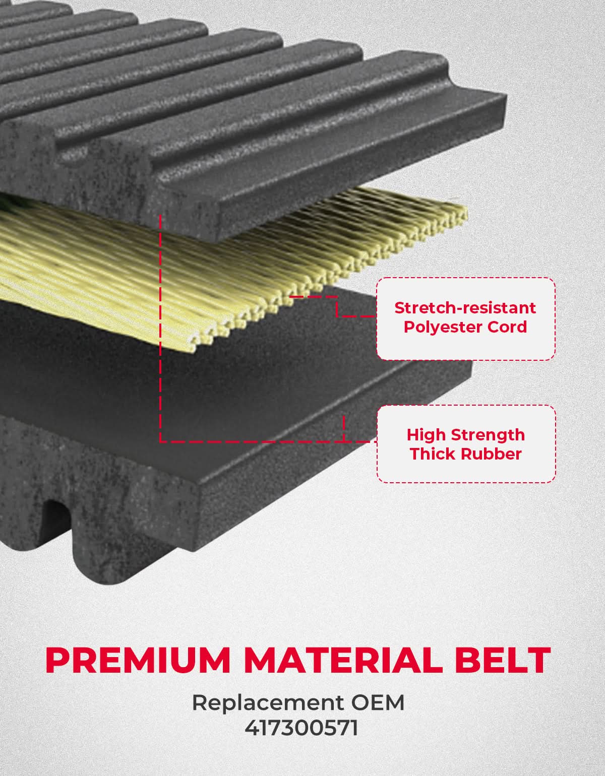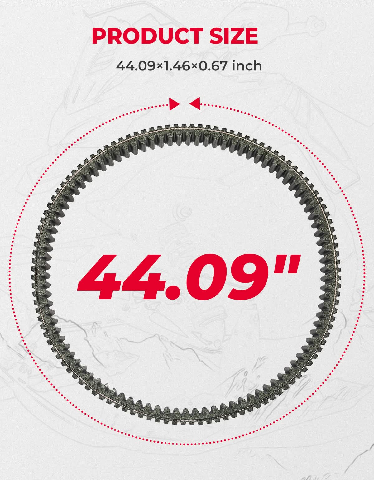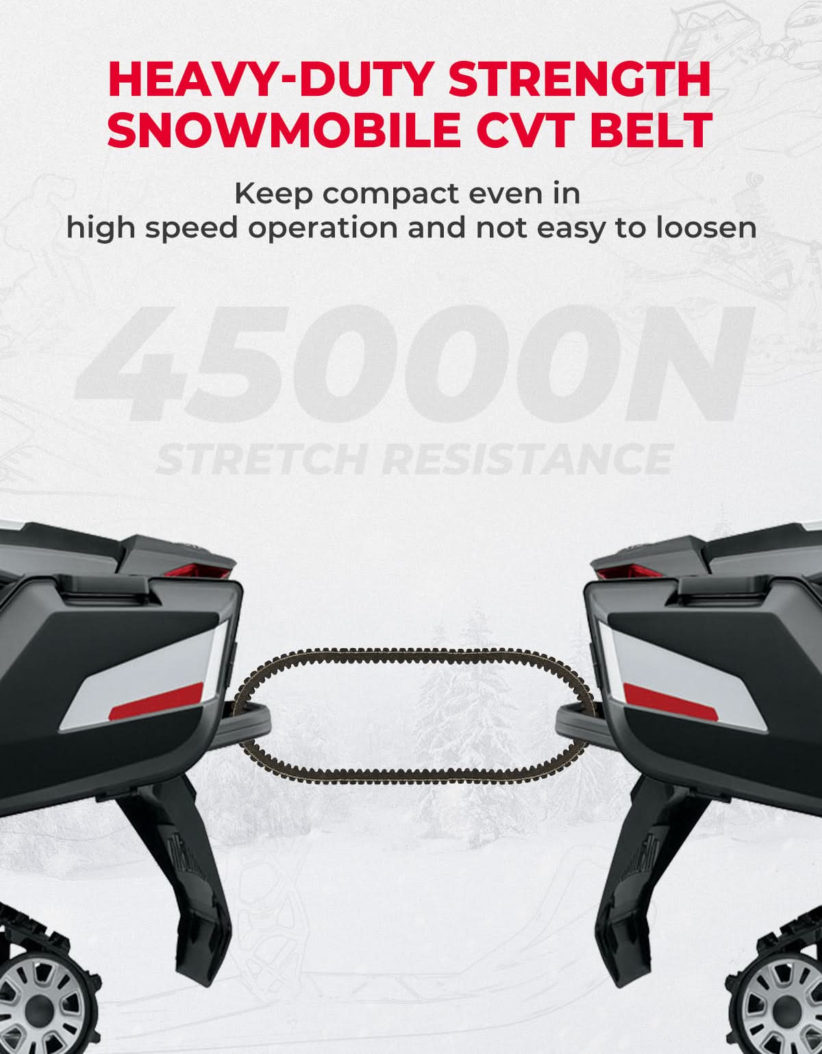 High-grade snowmobile CVT drive belt with dual-sided teeth, tear-resistant nylon layer, stable RPM, and 180°C heat tolerance for longer life and reliable performance.