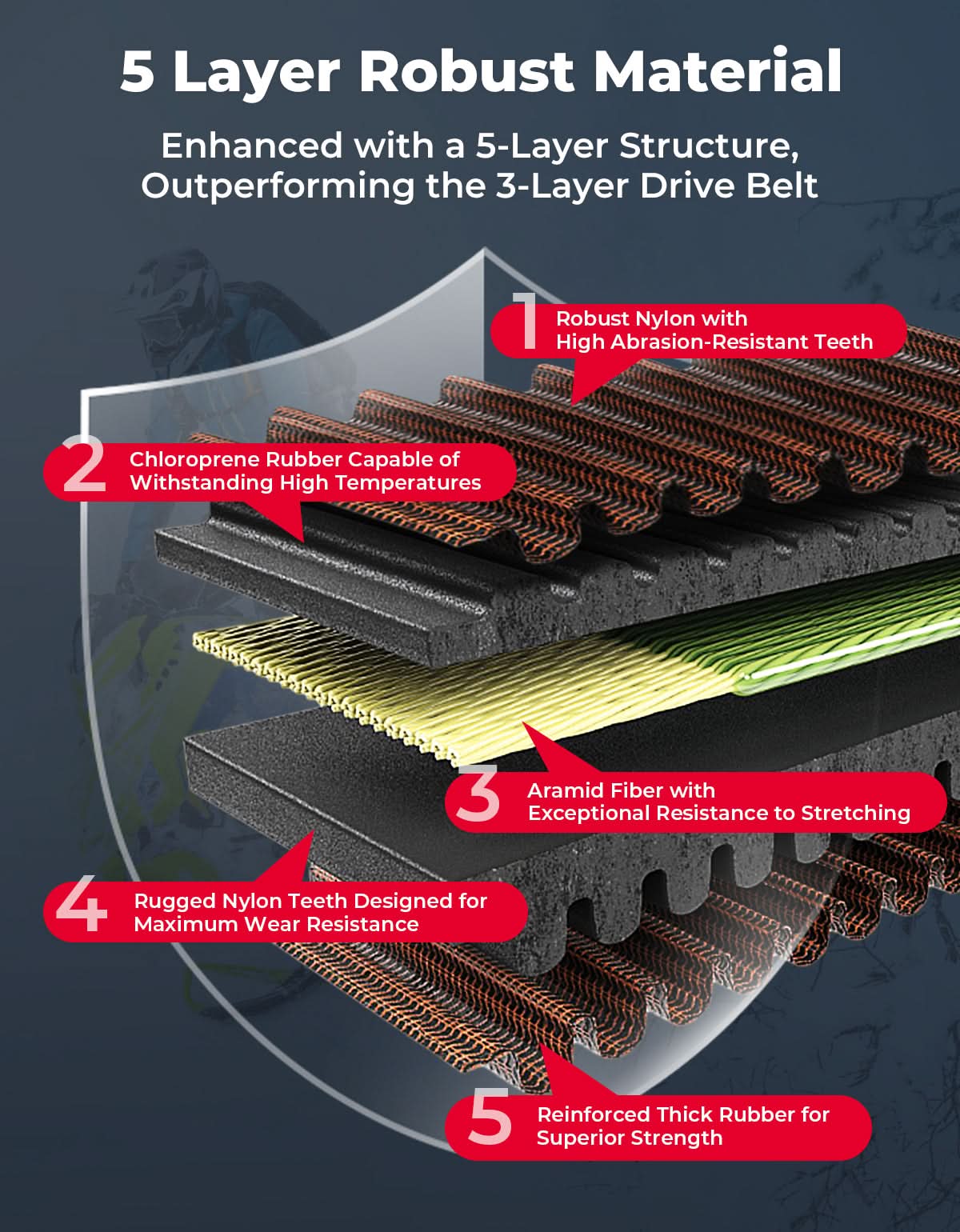 5-layer snowmobile CVT belt with dual nylon teeth, double-thick neoprene, and aramid fibers. -40°C–140°C capable, 45,000N tensile strength, stable performance, replaces #3211216.