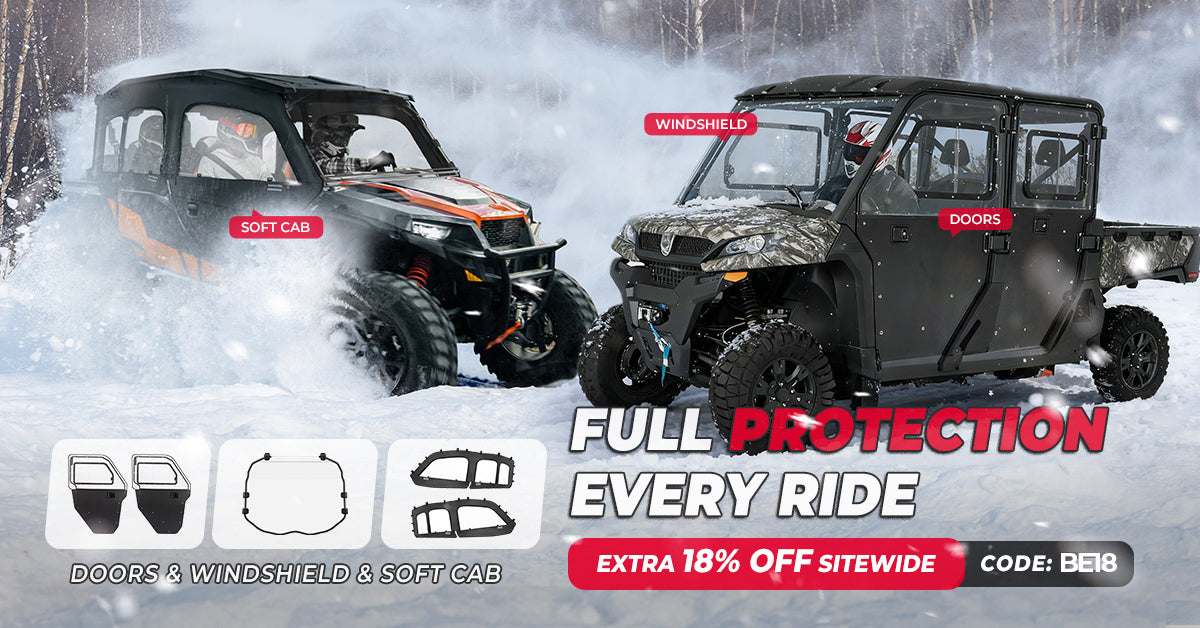 Enhance your UTV with our Full Protection lineup, featuring Doors, Windshields, and Soft Cab Enclosures. Built to guard against wind, rain, snow, and trail debris, each product delivers reliable coverage without compromising visibility or airflow. Crafted with durable materials and designed for easy installation, they’re ready for both rugged off-road adventures and tough work environments. Whether you’re braving harsh weather or simply looking for a more comfortable ride, our Full Protection collection keeps you secure, confident, and prepared for every journey.