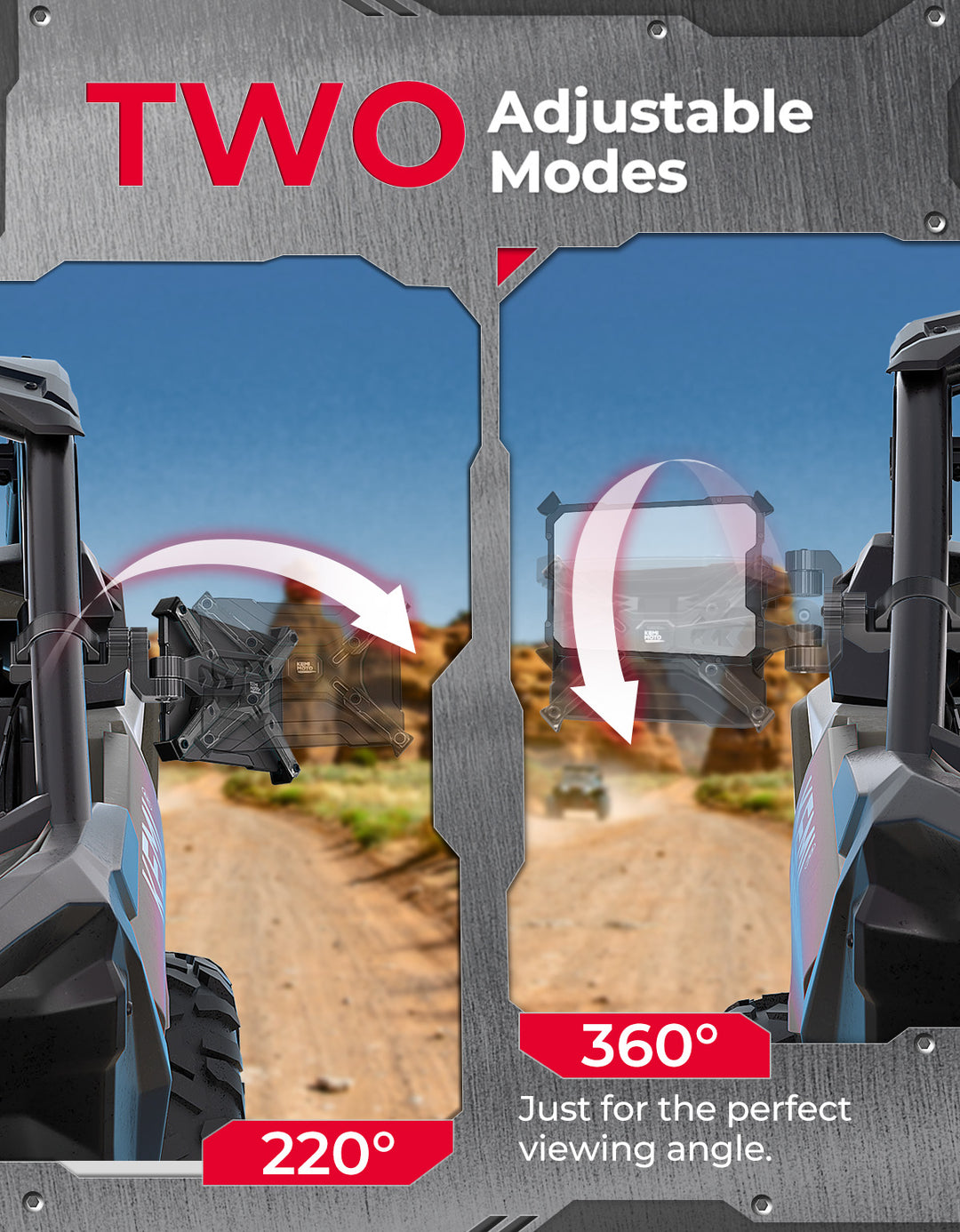 These SXS mirrors are compatible with 1.65" to 2" UTV roll cages, including popular models like Polaris RZR, Teryx, Pioneer, Zforce, and Rhino. The adjustable mounting bracket allows horizontal and vertical rotation, ensuring easy angle adjustments and a clear, wide field of view.