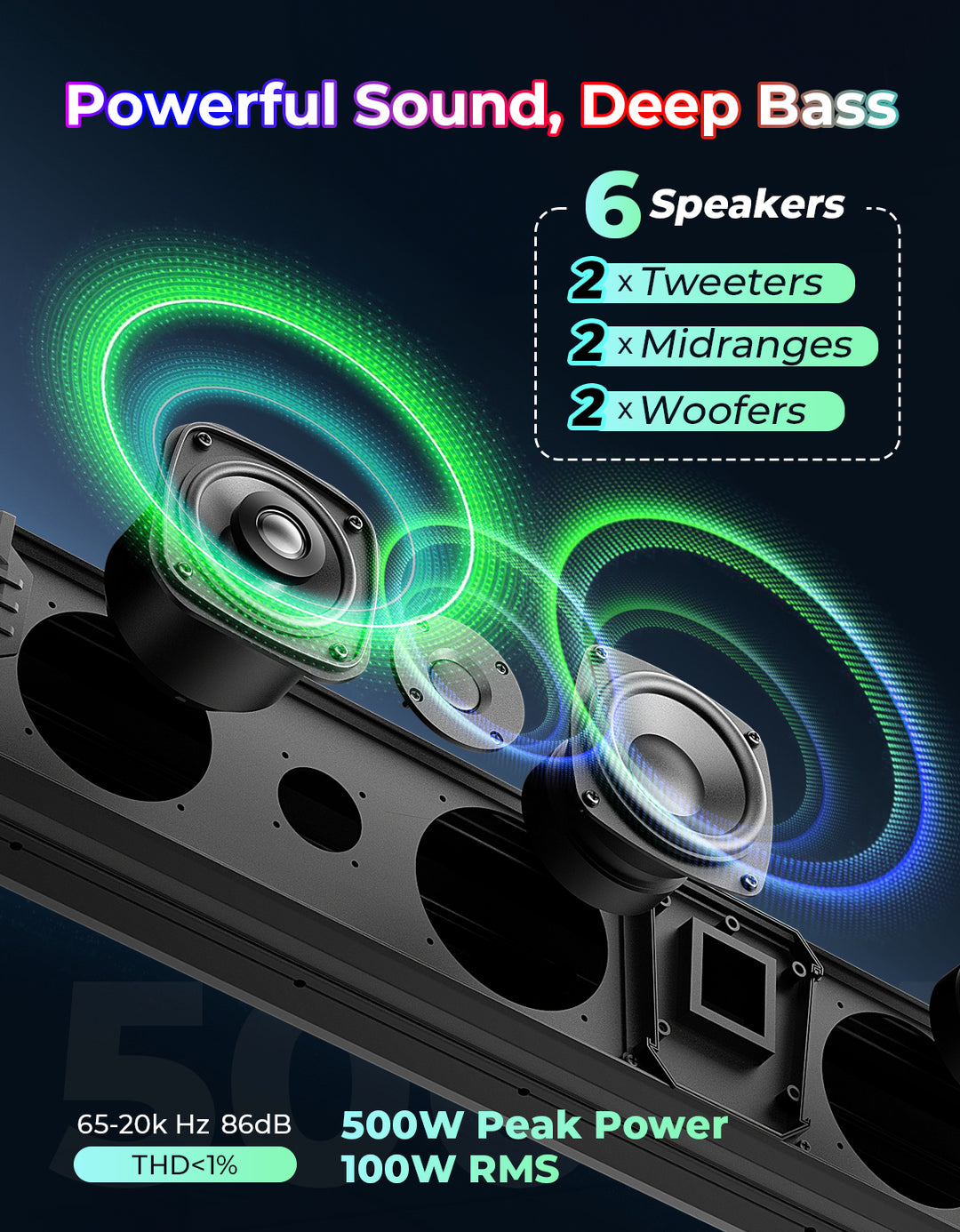 It features 6 built-in speakers — 2 woofers, 2 tweeters, and 2 midrange drivers — powered by a DSP system for distortion-free sound, deep bass (down to 65 Hz), and clear vocals across the full frequency range.