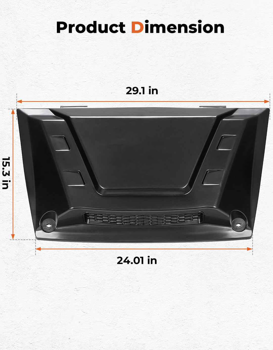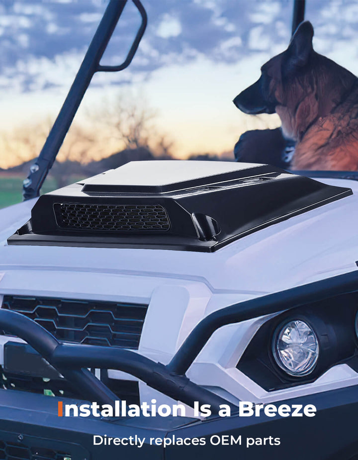 Kemimoto hood scoop for Kawasaki Mule Pro FXT features large vents for better airflow and engine cooling, ensuring a more comfortable ride. Easy to install, it directly replaces OEM parts. Made from durable, lightweight polypropylene, it offers excellent impact and corrosion resistance.