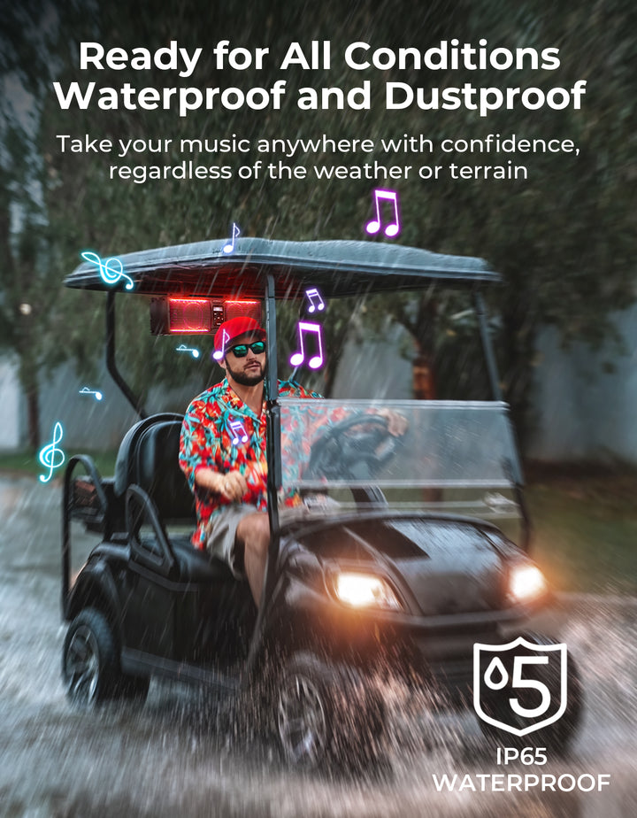 RGB Multi-color lights flash to the music beat. KEMIMOTO Golf Cart sound bar allows you to choose from multi-color illumination options with wireless remote control or onboard button control.