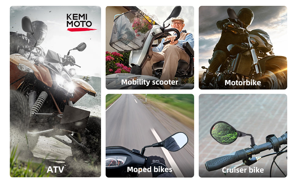 These kemimoto mirrors equipped 3 accessories. 7/8" handlebar mount for those ATV which don’t have mounts for mirrors. 10mm to 8mm RH/RH and 10mm to 10mm RH/LH screws are equipped for bikes with mirror mounts.