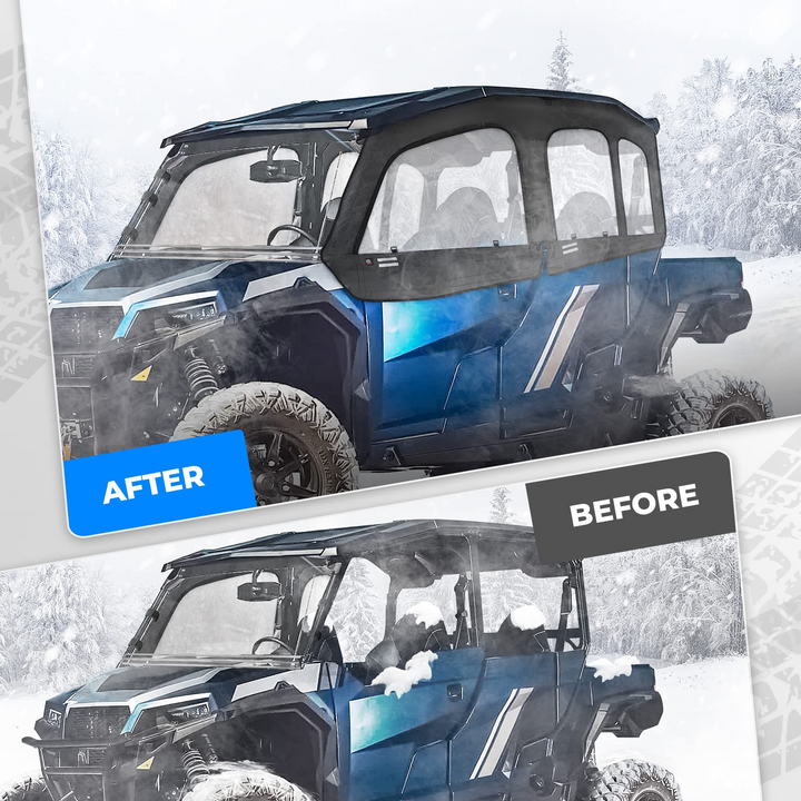 Upgrade your Polaris General XP 4 1000 with Kemimoto soft upper doors, designed to keep you comfortable in every season. Made from durable PVC fabric with high-definition transparent film, these Polaris General upper doors provide clear visibility, water resistance, and scratch protection. The zippered roll-up windows let you quickly switch between blocking out rain and allowing fresh airflow, while the no-drill installation makes setup fast and easy.