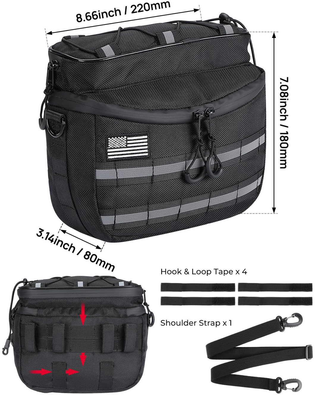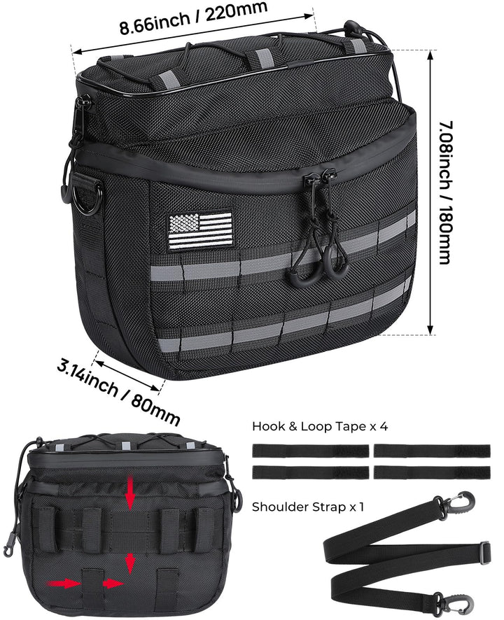 The KEMIMOTO Motorcycle Handlebar Tool Bag with Reflective Strips is a versatile storage pouch designed for cruisers, Softail, Dyna, and Sportsters. This durable handlebar bag also fits bicycles, sissy bars, and front forks, offering ample space for your essential tools and accessories. With its reflective strips, it ensures visibility and safety during night rides.