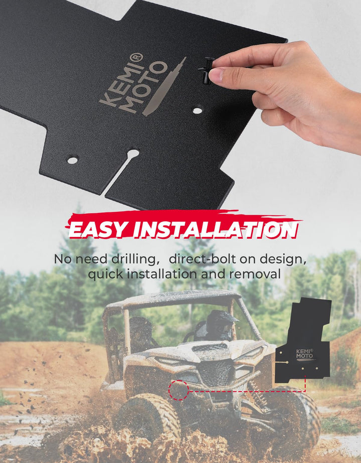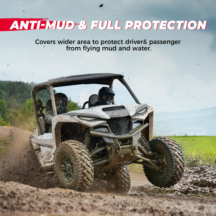 The Yamaha Wolverine mud guards are made of high-quality and thick PP material, which provides corrosion resistance, and impact resistance, and makes them not easy to break. The Kemimoto mudguard effectively blocks mud from entering the front wheel and the steering column, protecting both the driver and passengers from mud and dust. Additionally, it reduces the airflow blown to the driver's hands through the steering column, keeping them warmer and increasing driving safety.
