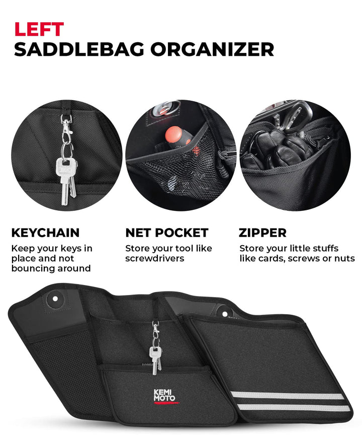 Transform your ride with our saddle bag organizer, the perfect way to keep your essentials sorted! With individual compartments, you can easily grab whatever you need while on the go. It features plenty of pockets for all your items, like your phone, keys, wallet, gloves, lock, goggles, and even your registration and insurance papers. Stay organized and ready for any adventure!