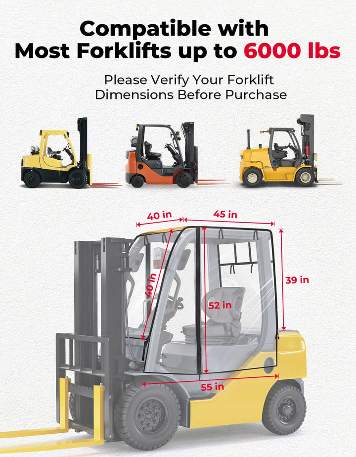 KEMIMOTO forklift cover offers year-round protection with clear anti-UV windows, roll-up rear ventilation, reflective strips, and a tool-free install system. Fits forklifts up to 6,000 lb for all-weather use and enhanced nighttime safety.