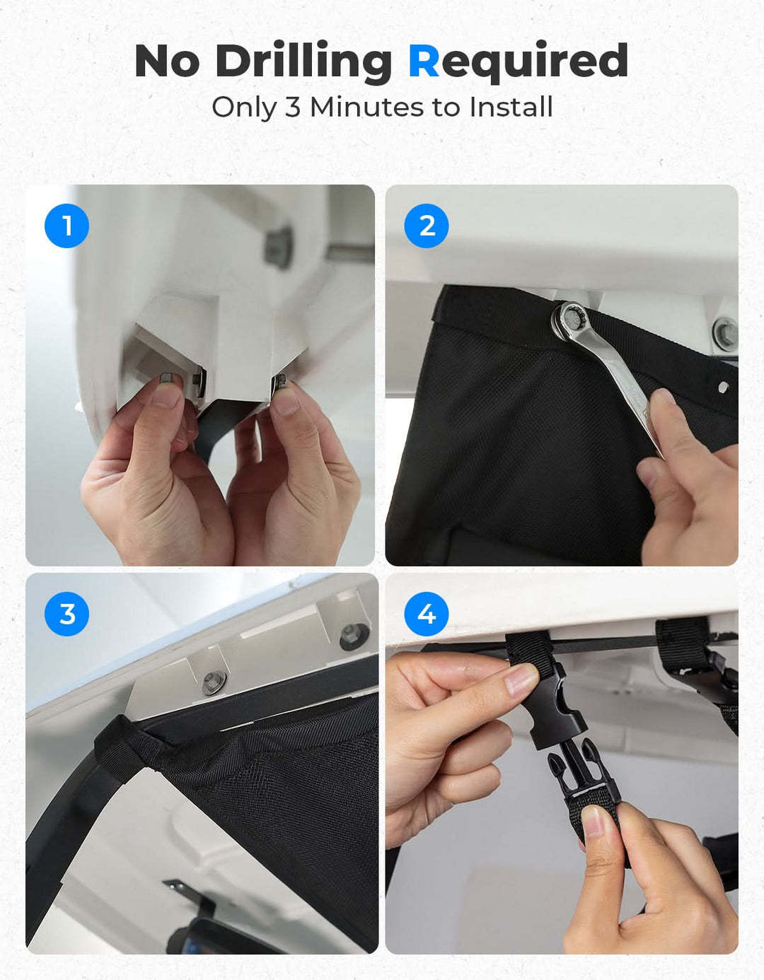 Keep your golf essentials organized with the KEMIMOTO overhead storage bag compatible with Club Car Precedent, Tempo, and Onward.Featuring four pockets and a built-in pen clip, this ceiling storage keeps balls, gloves, and scorecards within easy reach. The 1680D Oxford fabric resists tearing and sagging, while noise-reduction zipper loops prevent rattling on bumpy rides. Adjustable straps hold it tight against the roof for a clean look and clear rearview visibility. Installs in minutes with original screws—no drilling, no hassle, just extra space where you need it.