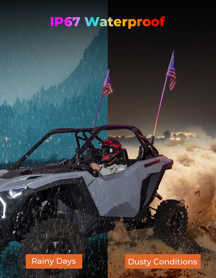 Kemimoto 3FT LED Whip Lights add vibrant style and safety to your ride with 366+ lighting modes, 10 brightness levels, and turn/brake/reverse functions. Control them via Bluetooth app or RF remote—even from a distance. The spring base absorbs shocks without breaking, while the IP67 waterproof build handles mud, rain, and rough terrain. Compatible with most 12V UTVs, ATVs, boats, and more.