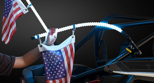 LED light whips for side-by-side has a quick-release mounting base for easy to install or take off. American Flags with adjustable mounting clamps to prevent the flag from entangling, let the flag wave in the wind on whip light flag pole. The aluminum base is 12mm dia (fits most whip mounts). Warm Prompt: Before plugging the whip lights to the connectors, be sure to align the holes (with convex on one end and concave on the other).