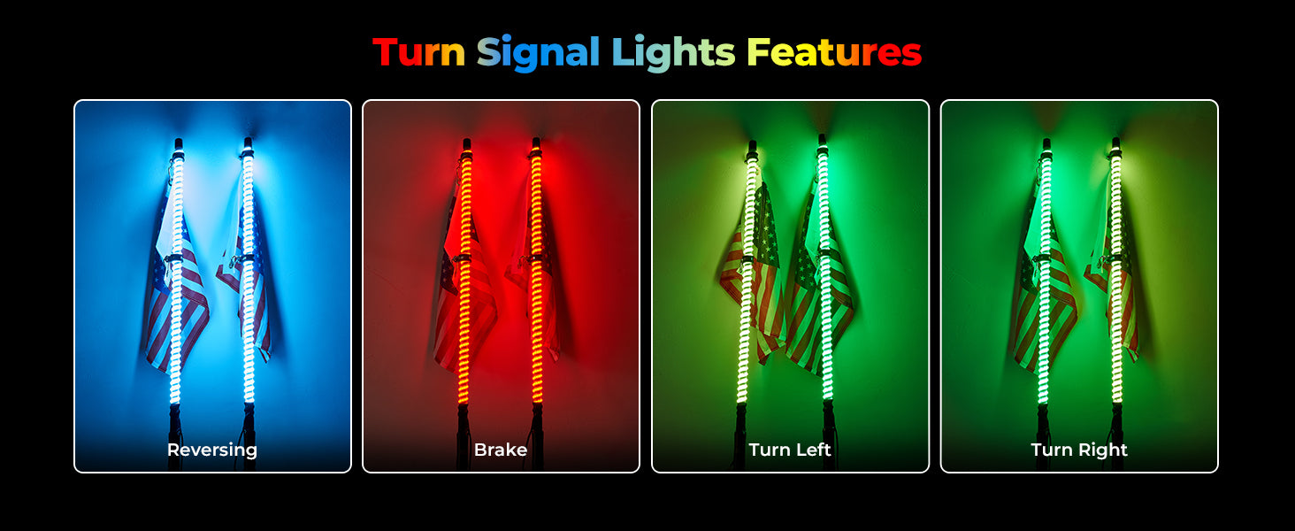 KEMIMOTO Bluetooth-controlled led whip lights for utv can be connected to taillights and turn signals for brake light and turn signal functions. Please refer to the manual for specific wiring connections.