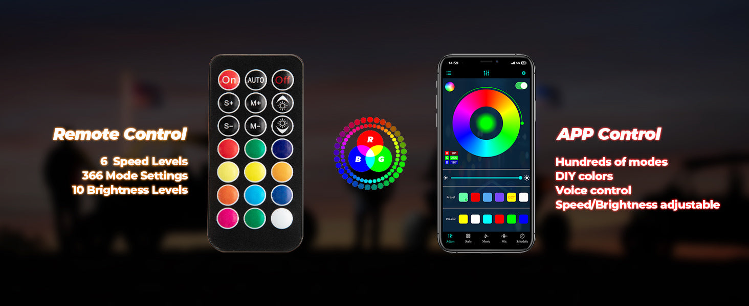KEMIMOTO atv whip lights can be controlled by Bluetooth or RF remote control. With the smartphone APP, there are 212 light mode settings, music sync mode, schedule timing function, 100 light speed adjustable levels, and 100 light brightness adjustable levels. With RF remote control, lighted whips for UTV have 366 light modes, 10 solid colors modes, 6-speed adjustable levels, and 10 brightness adjustable levels.