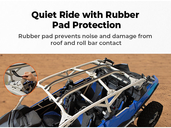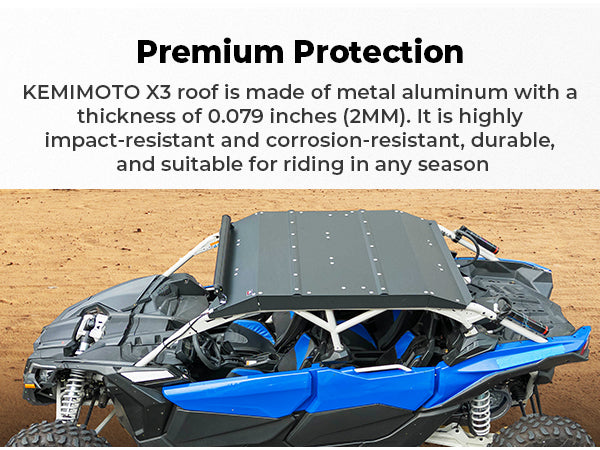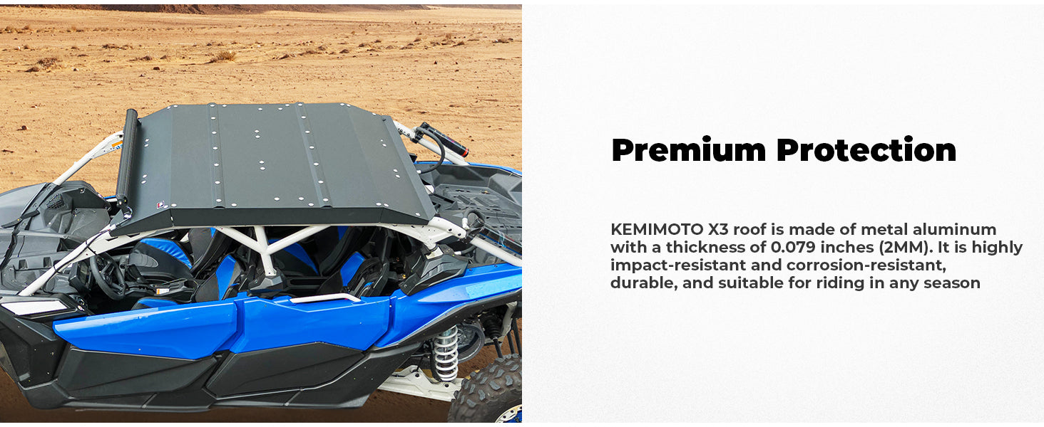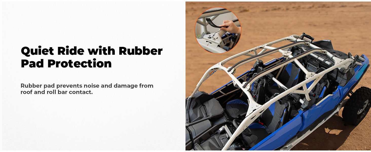x3 max roof is made of 2 mm aluminum with black powder coating, making it impact-resistant, corrosion-resistant, and durable. The metal material better protects the driver and passengers from wind, sun, rain, branches, debris, etc., providing a safe driving experience and keeping the cab clean. Besides, The x3 roof is equipped with rubber pads to prevent direct contact between the roof and roll bar, reducing noise and preventing potential damage during driving.