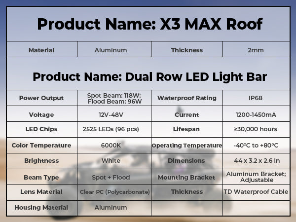 Package includes x3 max aluminum roof, 44" LED light bar, a pair of upper roof brackets, 1 rocker switch wiring kit. No extra parts or complex wiring needed – everything ships as a ready-to-mount system