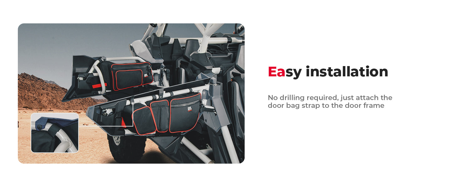 KEMIMOTO x3 door bags are easy to install on the upper doors, just wrap around the upper door frame with the sticky strap, no tools are needed