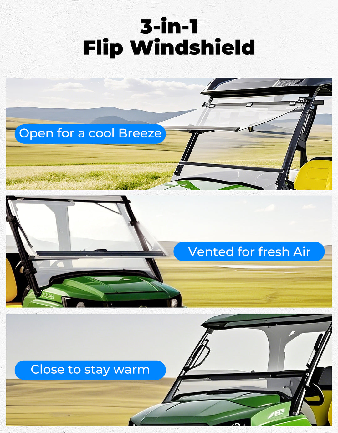 Stay in control of your ride no matter the weather with this John Deere Gator 3-in-1 Flip Windshield. Whether you're working hard or enjoying the trail, this versatile John Deere Gator windshield lets you ride your way — fully open for maximum airflow, vented for fresh air without the dust, or closed to keep out wind, rain, and cold. Built for convenience, it features tool-free installation with no drilling required and easy adjustment on the go. Perfect for year-round use, this durable, easy-to-install UTV windshield delivers both performance and protection for your Gator.
