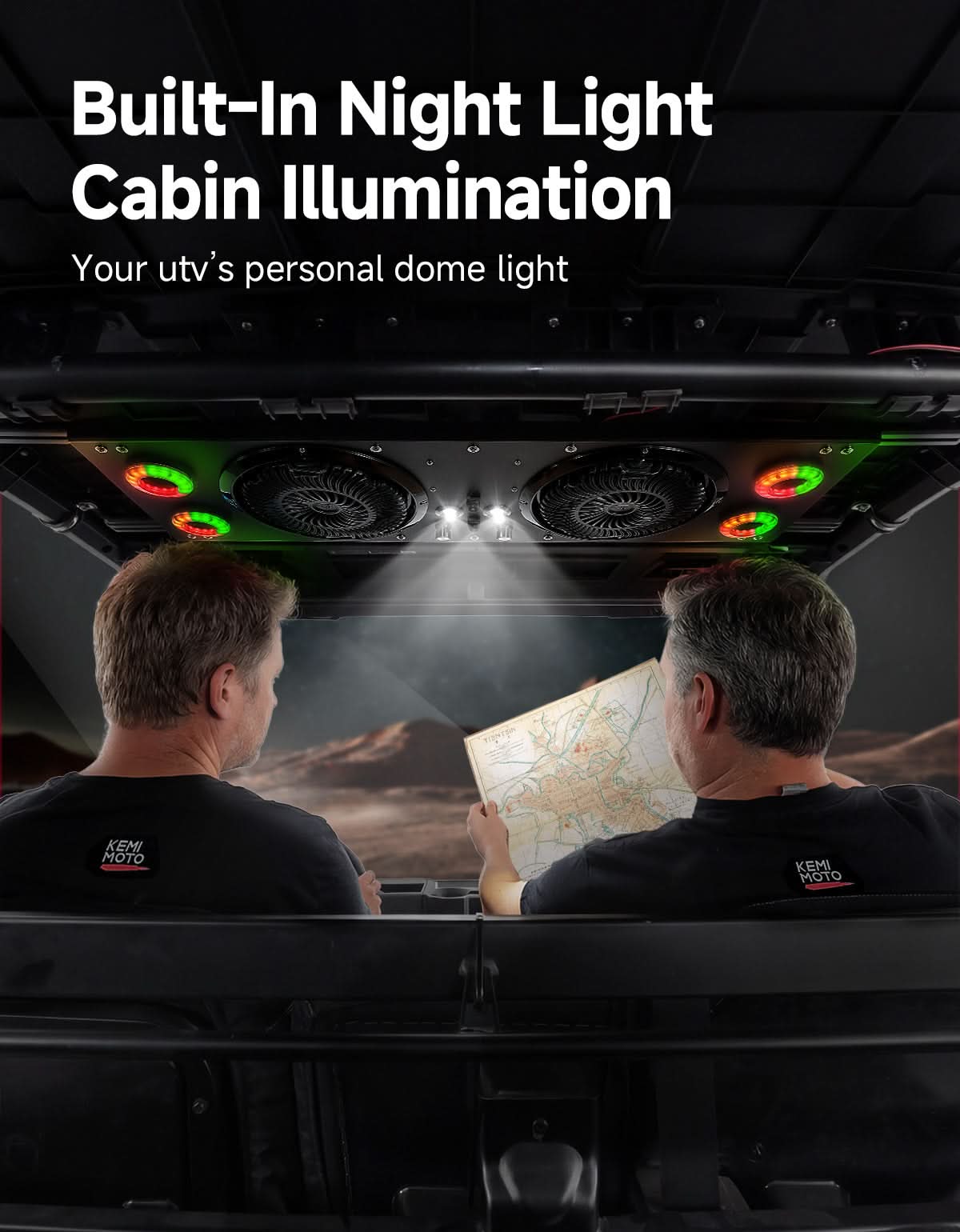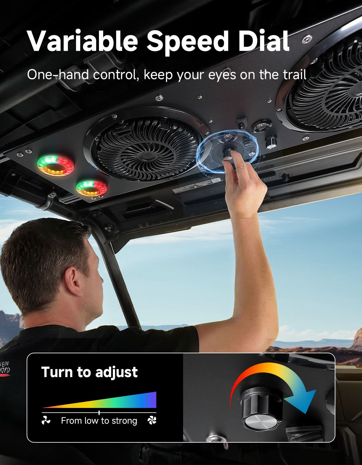 Upgrade your UTV with a dual 8-inch fan system offering 930 CFM airflow, adjustable dual-direction cooling, LED dome light, RGB halos, and IP66 water resistance.