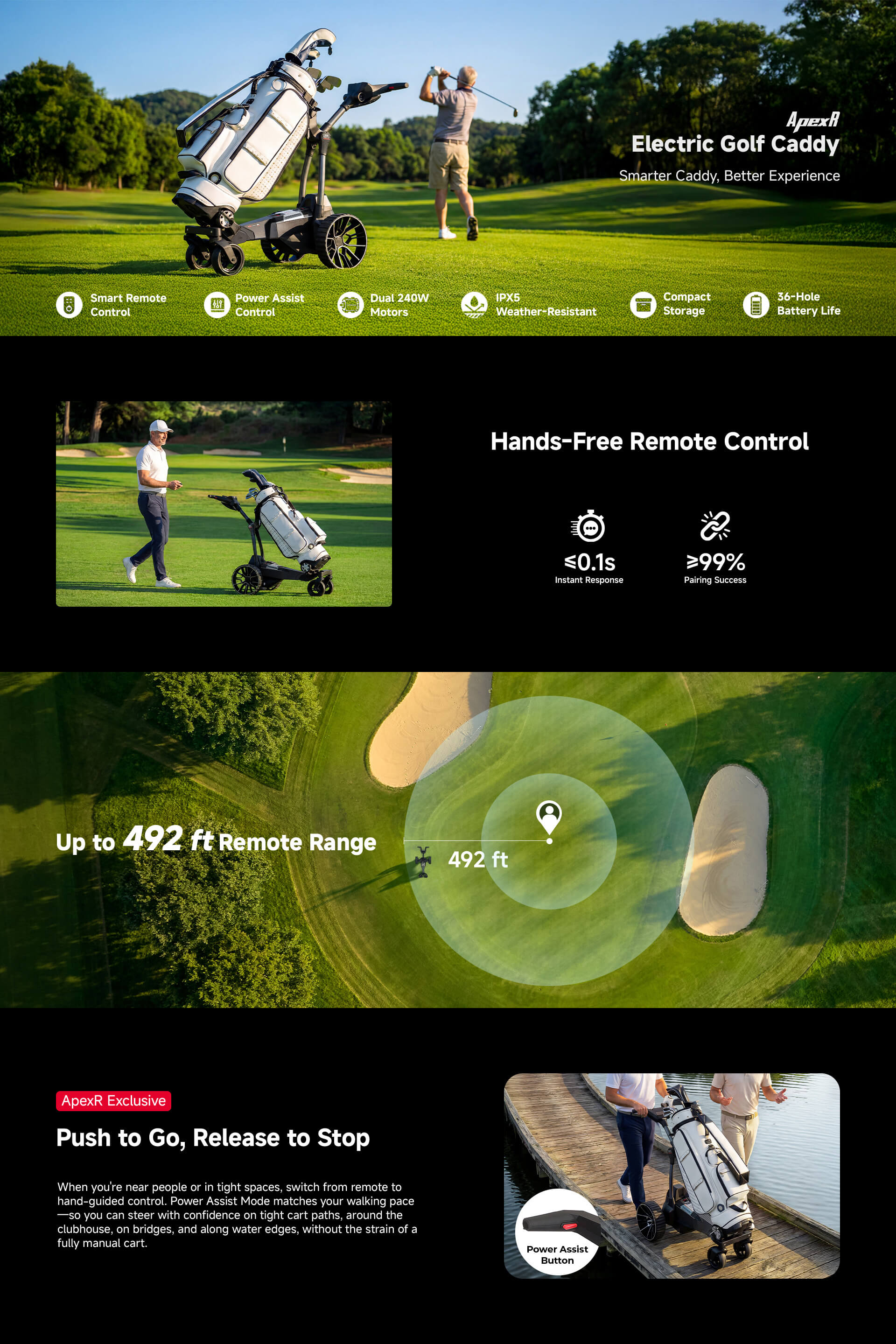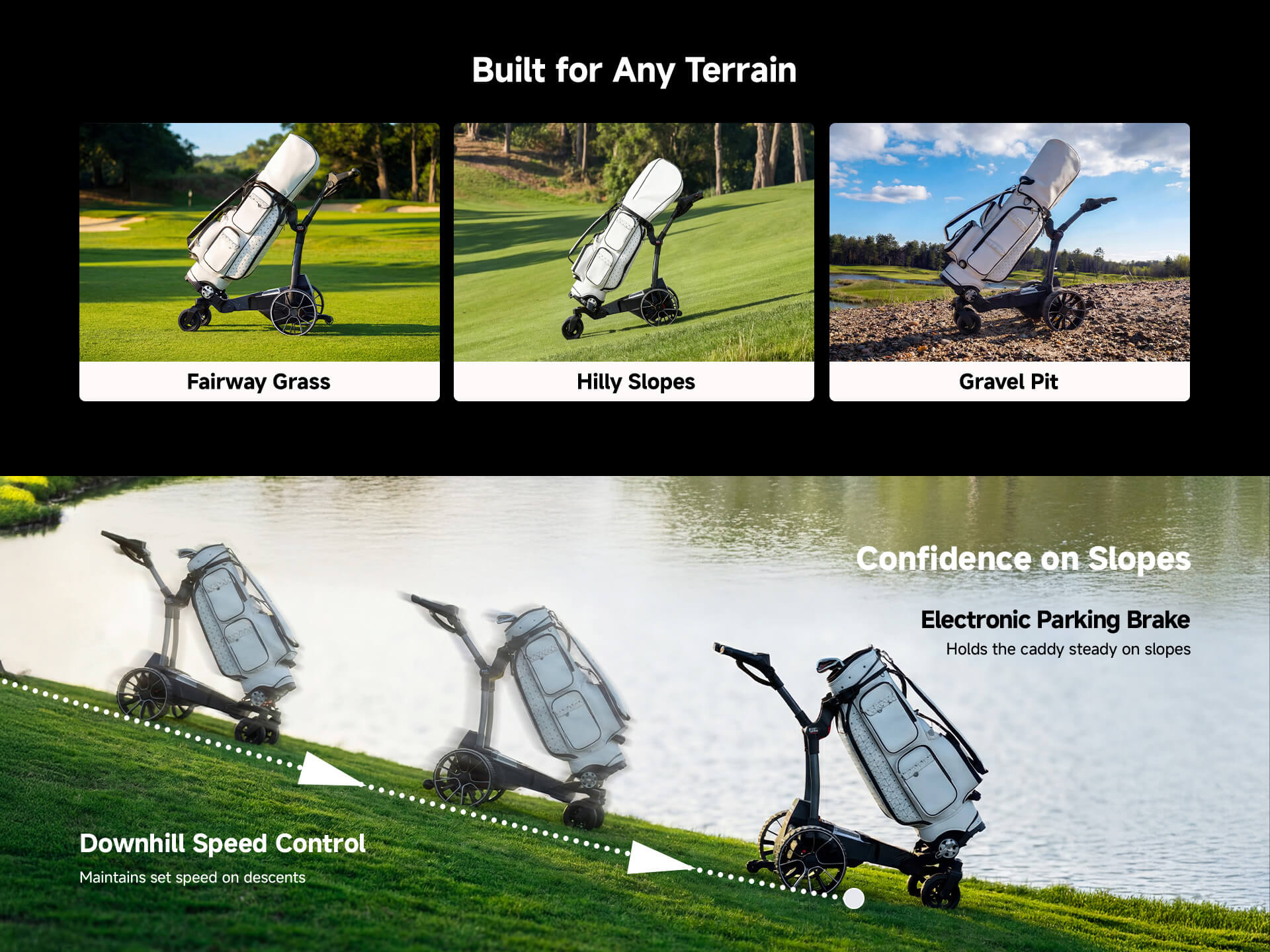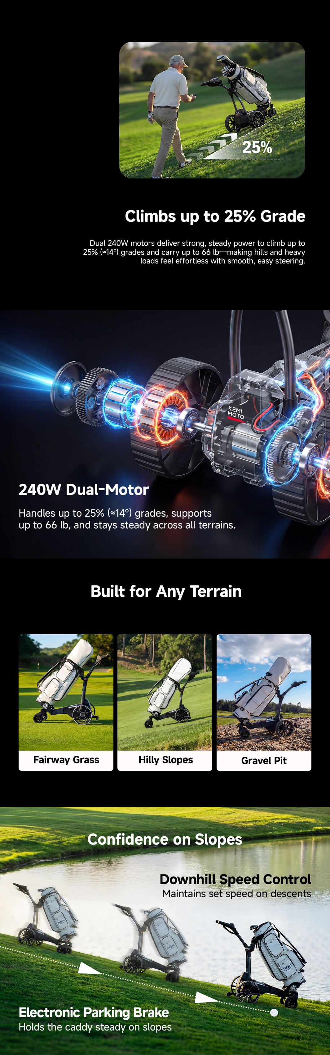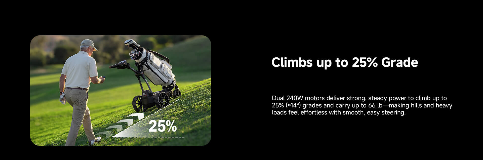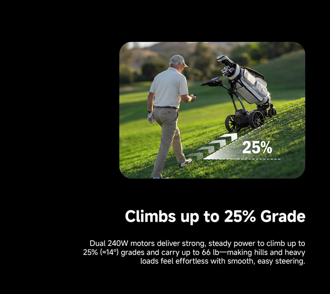 Yes. Dual 240W motors easily conquer slopes up to 25% (14°). Big wheels and anti-tip wheels design help it stays steady on fairways, wet grass, and gravel paths.