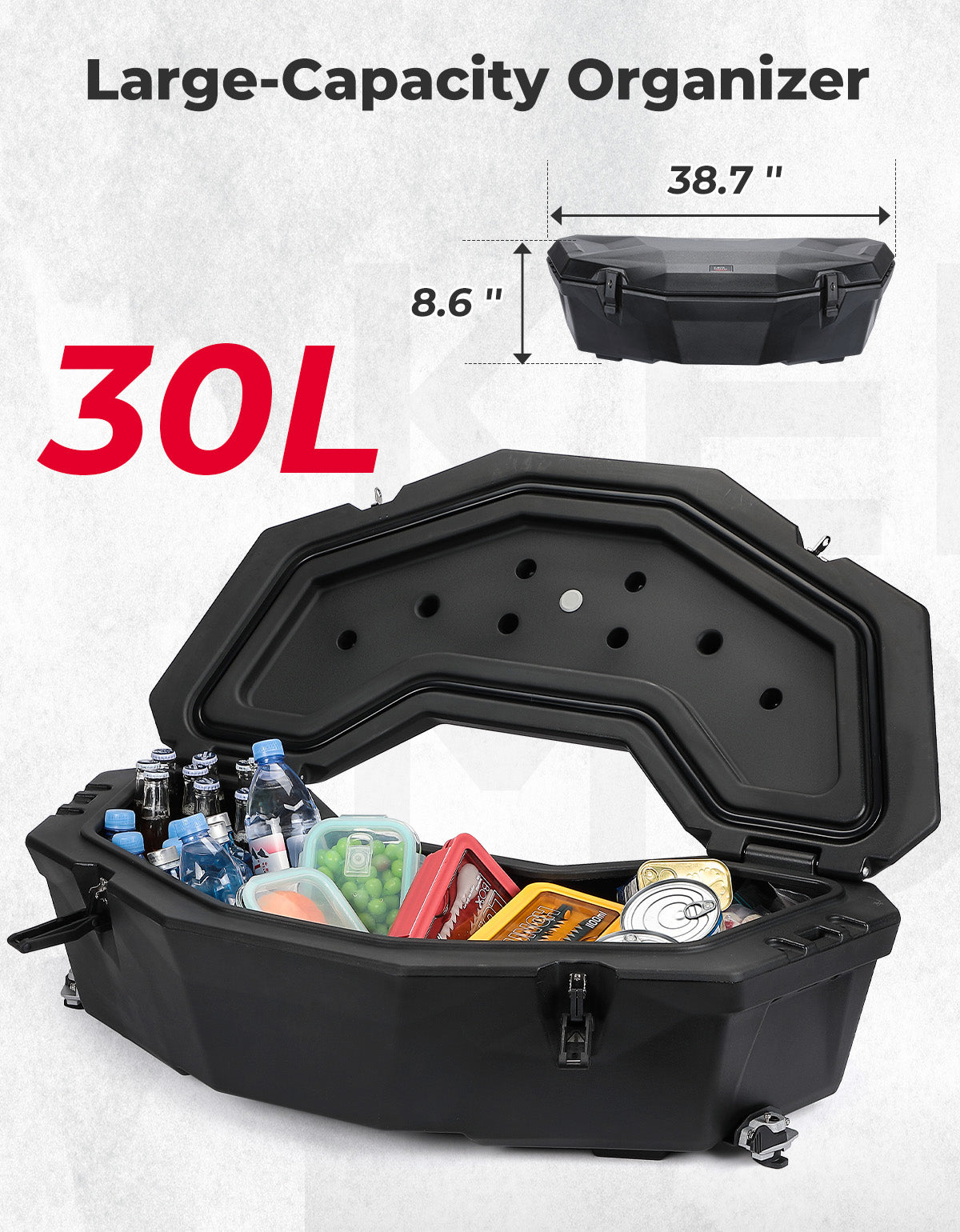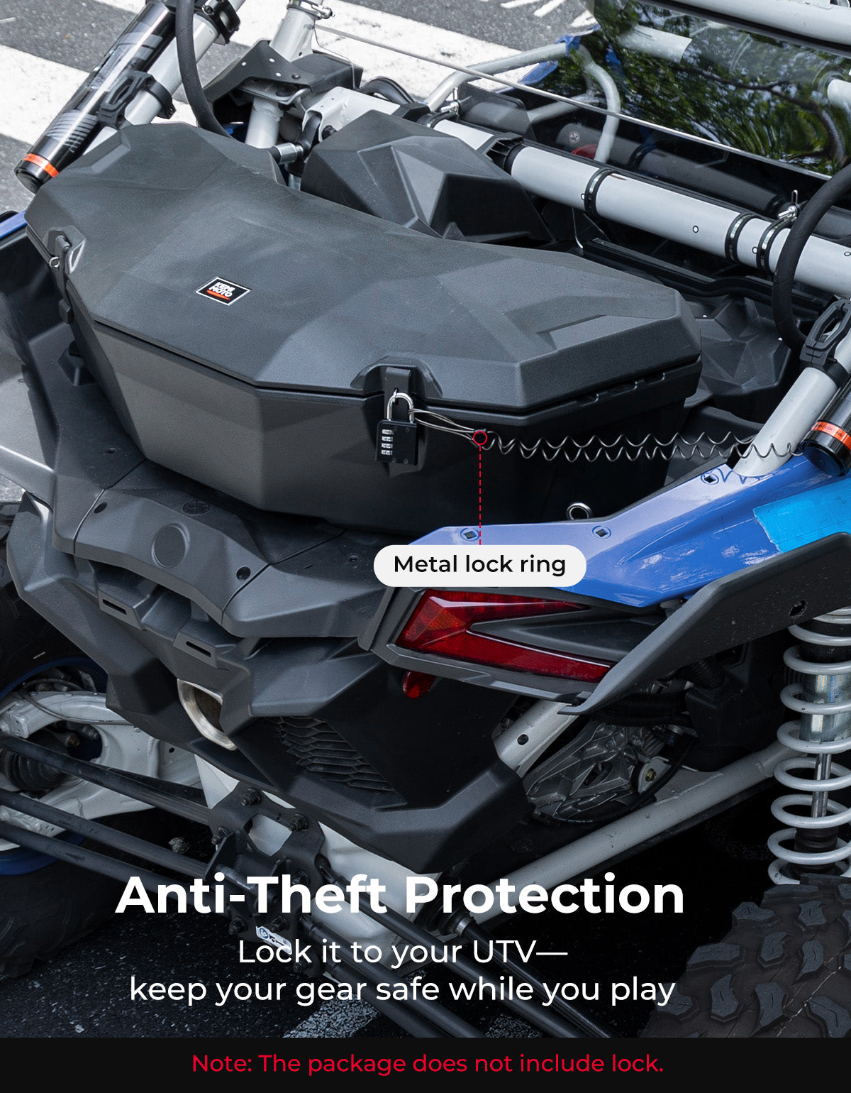 The Can-Am X3 Storage Box measures 35.9 x 20.4 x 12.5 inches, so there is plenty of room to store the tools, spares and other essentials you need.