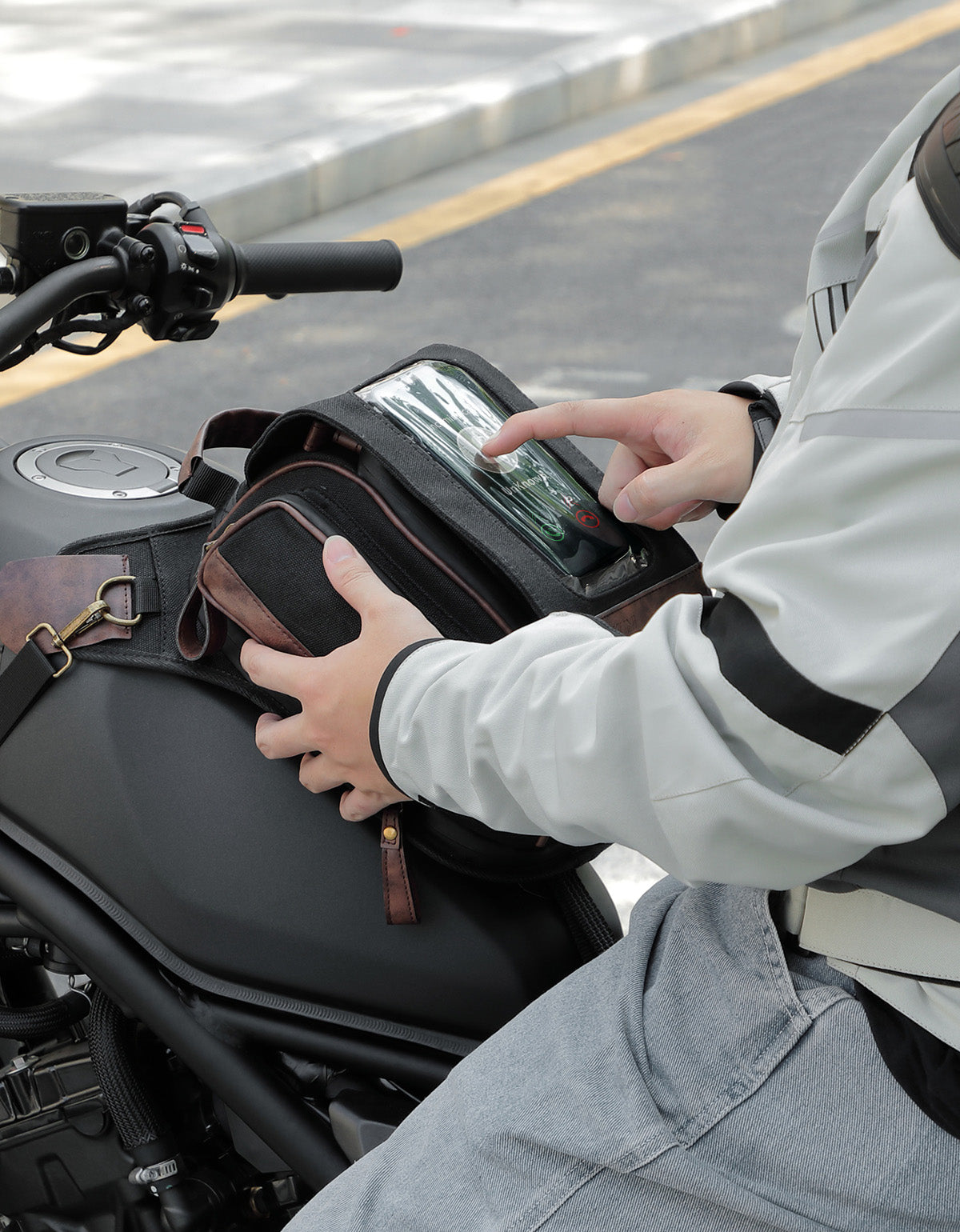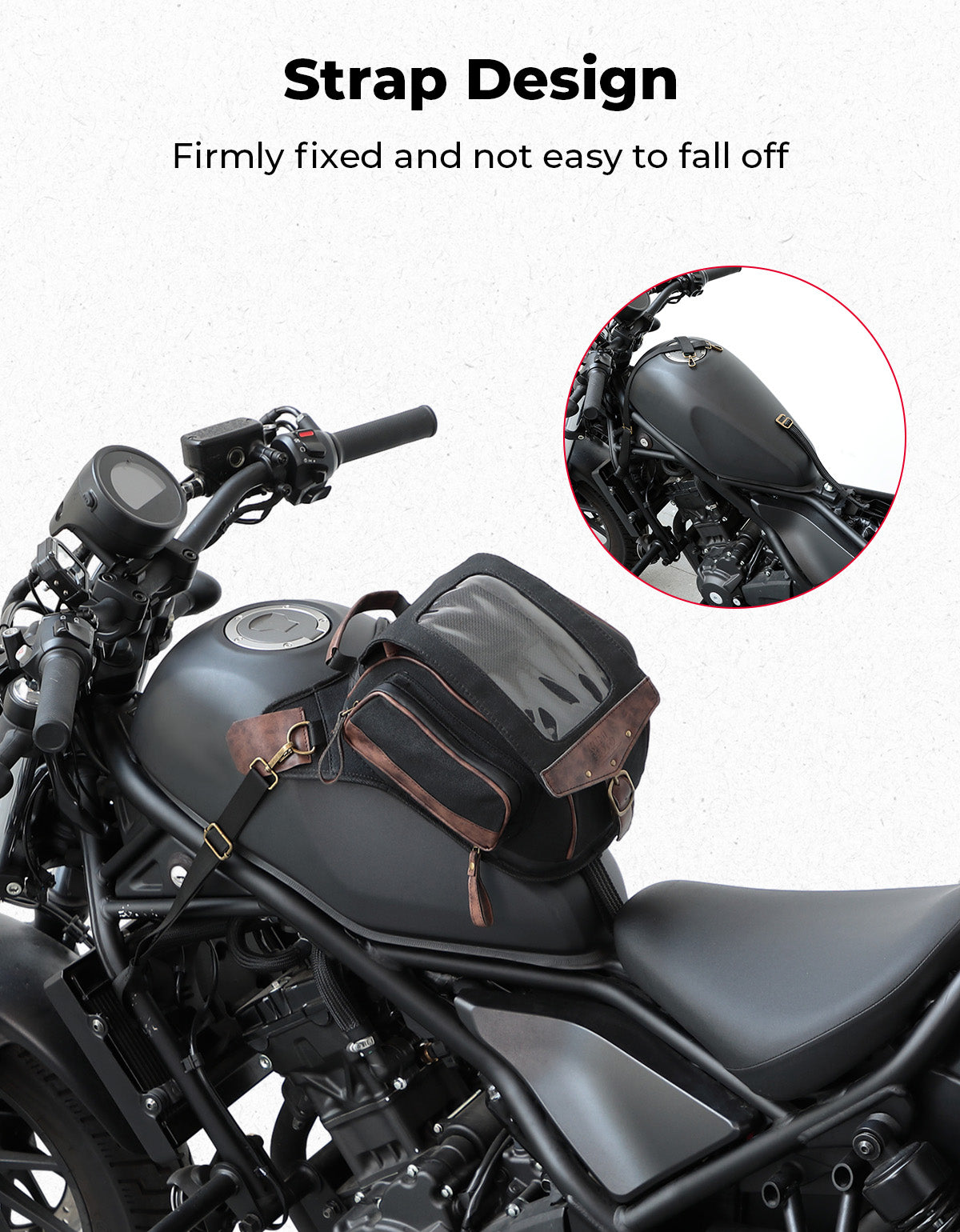 The KEMIMOTO motorcycle tank bag offers an expandable 8.5L capacity with four zippered pockets, dual side compartments, and a mesh organizer, plus a 2.36-inch expandable main pocket for essentials like phones, wallets, water bottles, rain gear, flashlights, or medical supplies. Crafted from premium waxed canvas and leather, it delivers retro style with excellent wear resistance, while sealed waterproof zippers and an included rain cover keep valuables protected. A touchscreen window allows safe phone operation during rides, and its versatile design adapts as a leg bag, waist bag, chest bag, sling bag, or thigh pack—ideal for biking, camping, hiking, travel, photography, fishing, hunting, or daily carry. Equipped with adjustable motorcycle and leg straps, the KEMIMOTO thigh bag fits various motorcycle types and installs easily with the included instructions.