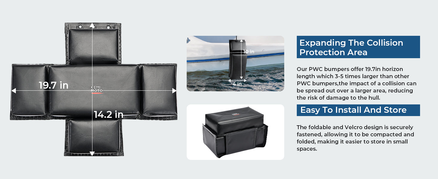Our PWC fender offers 19.7in of horizontal padding which is 5 times more than other PWC fender bumpers.Expanding The Collision Protection Area,the impact of a collision can be spread out over a larger area, reducing the risk of damage to the hull.