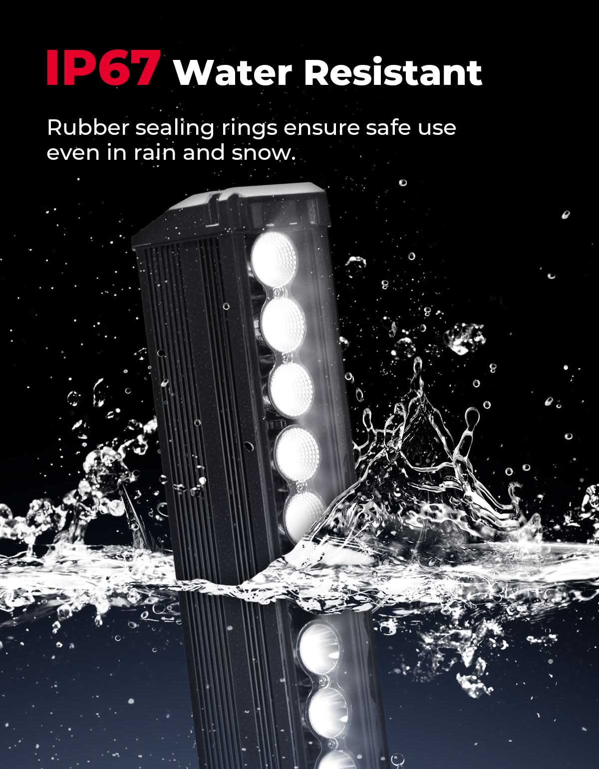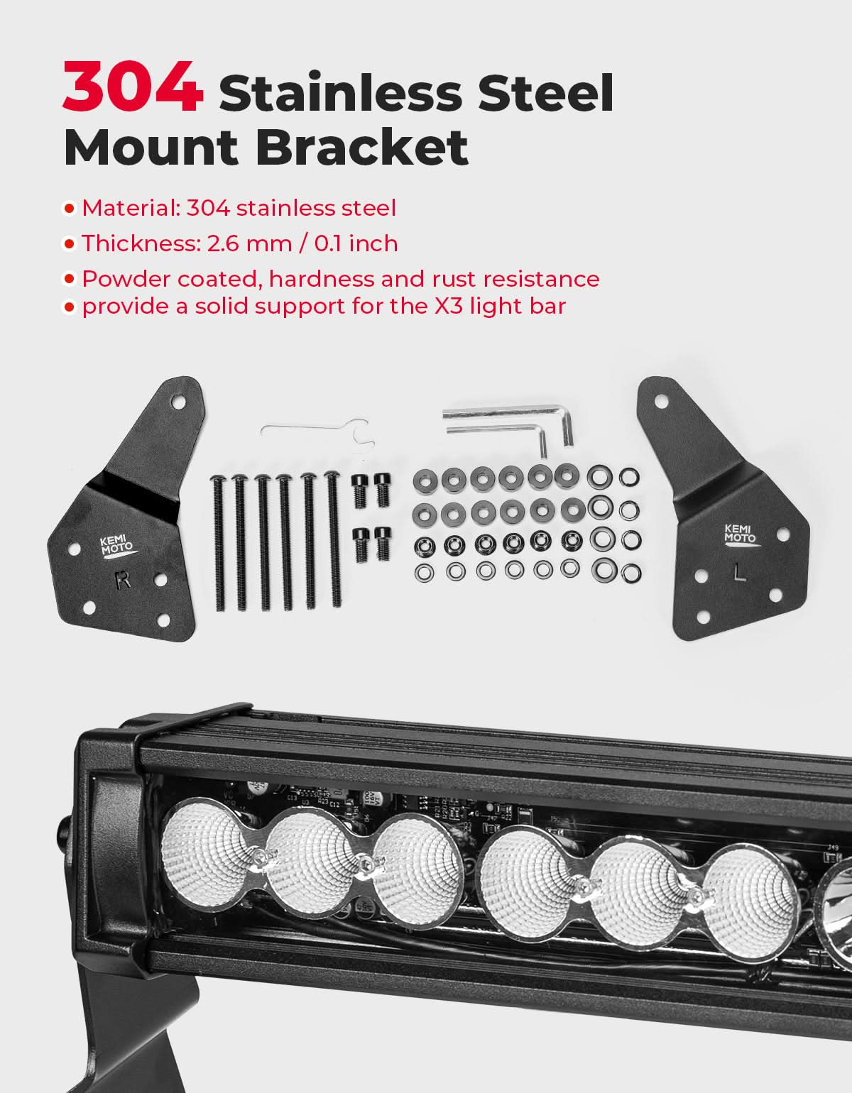 The KEMIMOTO 50" X3 LED light bar delivers powerful nighttime visibility with 15,500 lumens from high-output 10W LEDs. Its combined spot and flood beam design provides long-range focus and wide coverage for safer off-road driving. Featuring eight lighting modes, including white and ambient options, it enhances both functionality and style. Built with IP67 waterproof protection, a 50,000-hour lifespan, and sturdy 304 stainless steel brackets, this light bar is made to endure harsh conditions. The complete kit installs easily using factory mounting points and fits select Can-Am Maverick X3 and Maverick R models.